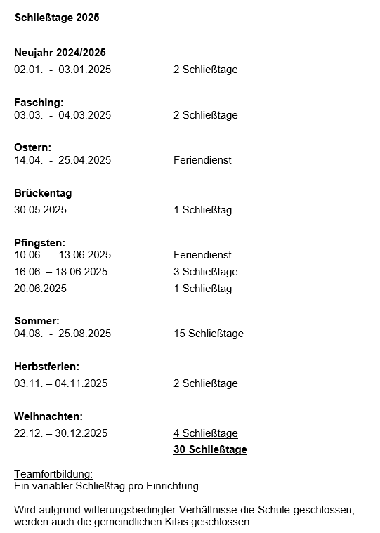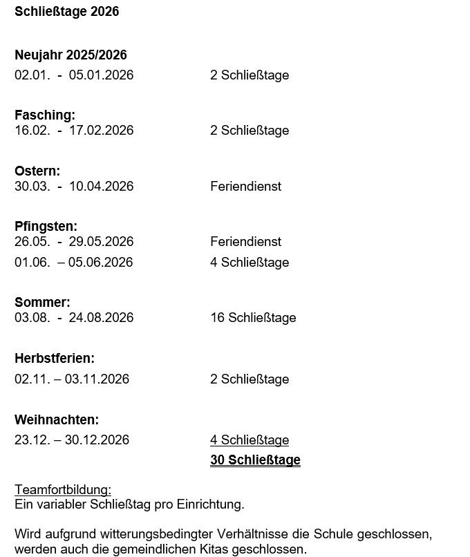Während des Kindergartenjahres vom 1. September bis 31. August des darauffolgenden Jahres ist die Einrichtung an 30 Tagen geschlossen.